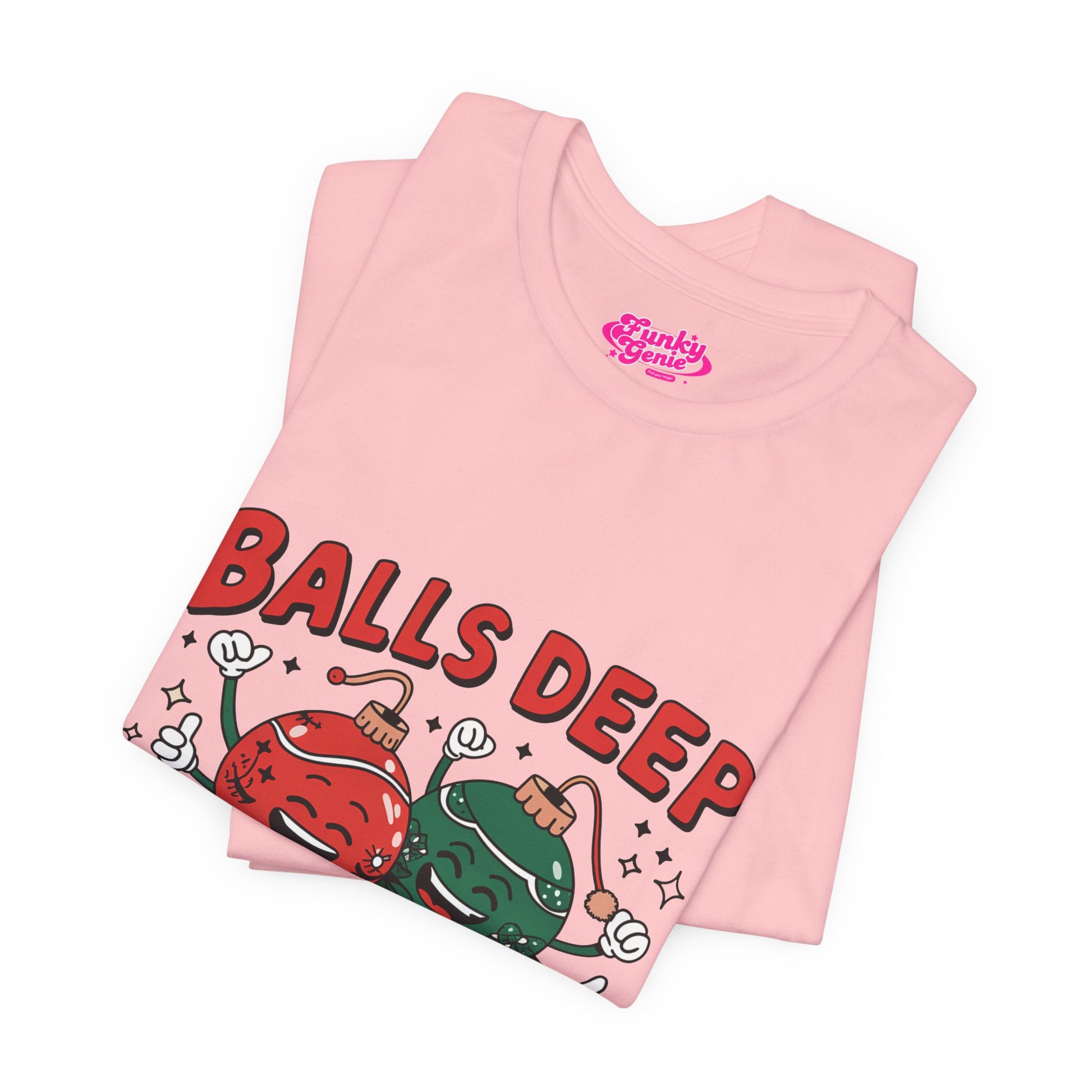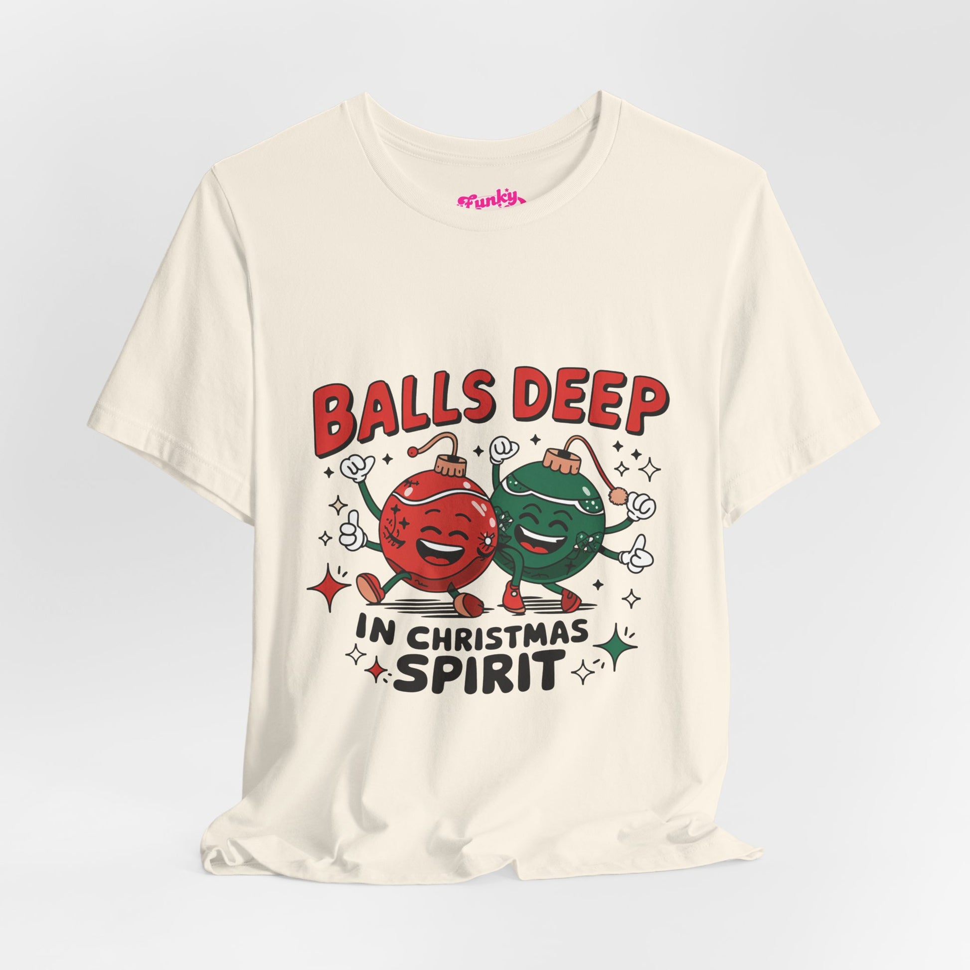 Balls deep in Christmas Sprit -Funny Christmas Humor Tee, Unisex Jersey Short Sleeve T-Shirt with Holiday Design, Holiday Gift, Christmas Party Shirt, Festive Apparel