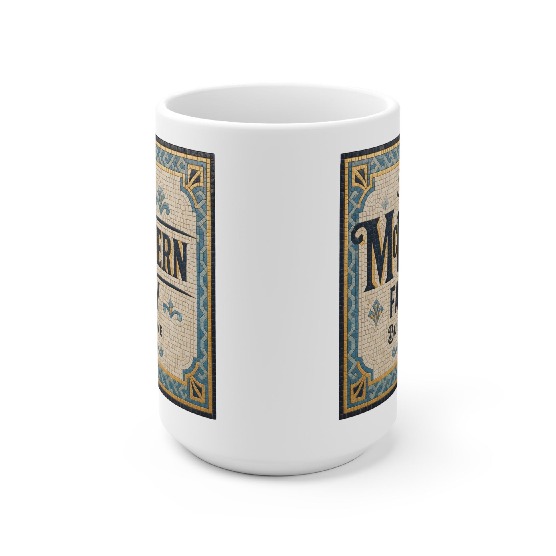 Bring warmth and heritage to morning coffee with this vintage-inspired ceramic mug. The full-wrap design wraps an ornate, Mosaic like family name panel Each Mug design is Generated individually so there are some changes in design for each Mug making them one of a Kind. It’s the kind of mug that sits steady on a kitchen table while conversation wakes up, or quietly holds a late-night cup at the desk. The large C-handle and rounded shape make it comfortable to hold, and the sturdy white ceramic keeps the printed details crisp over time. REACH-certified and made to be used daily, it blends practical durability with nostalgic charm.