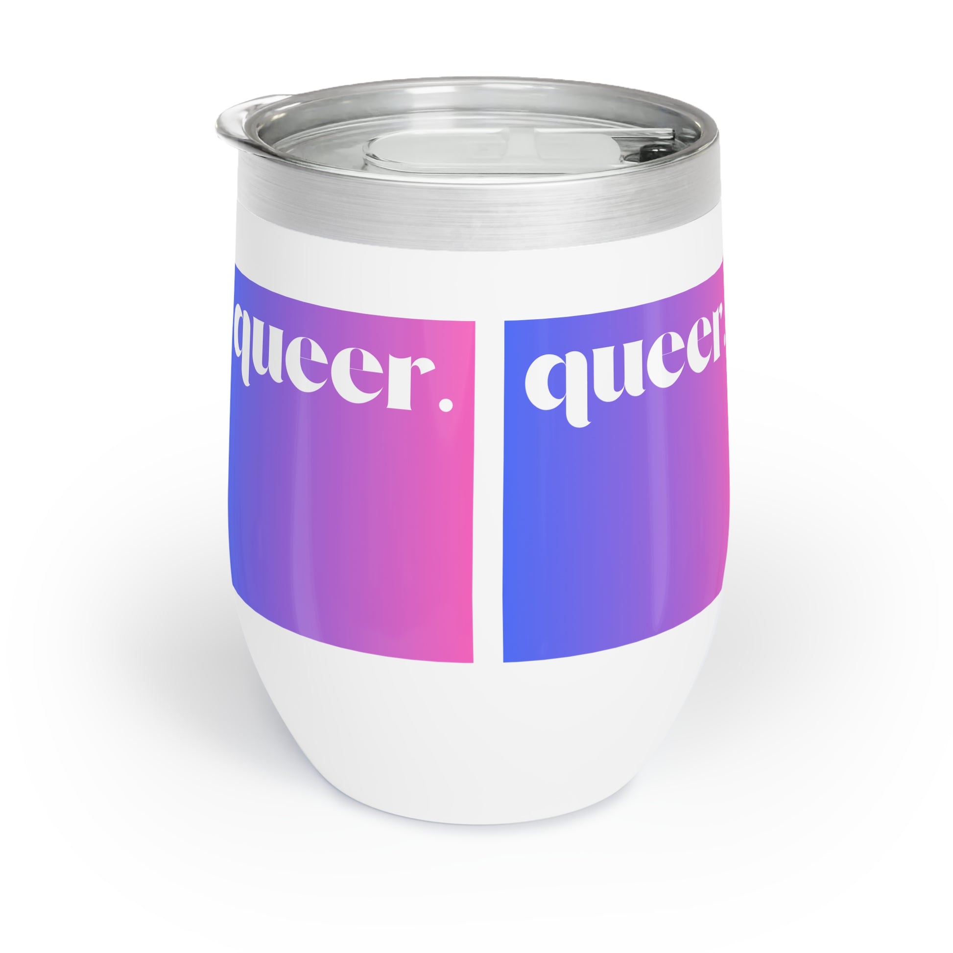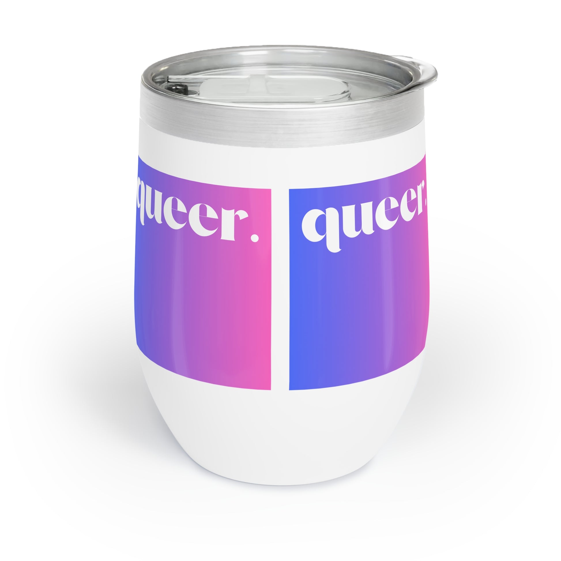 Empowering Chill Wine Tumbler with the word Queer against a purple and pink ombre background, perfect for the LGBTQ+ community. Keep your beverages hot or cold in this durable stainless steel tumbler, featuring a full wrap decoration for a personalized touch. Ideal for everyday use and makes a great gift for Pride Month or any celebration of LGBTQ+ empowerment.