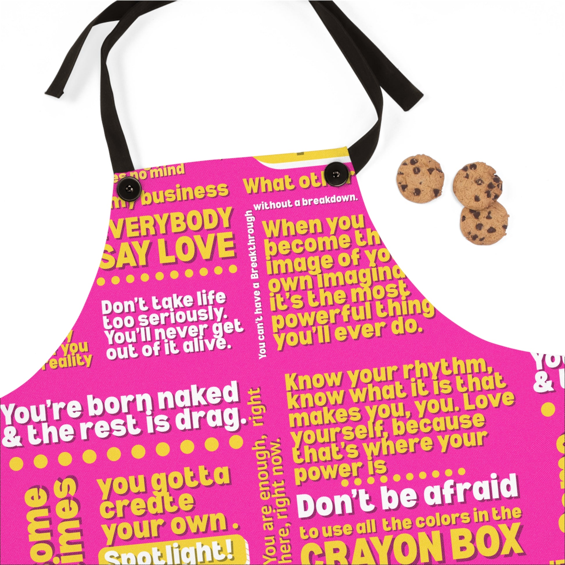 Elevate your cooking and crafting experience with this vibrant apron, designed to inspire creativity and joy in the kitchen. Covered in motivational quotes and colorful graphics, this apron adds a fun and lively atmosphere to your culinary adventures. Whether you're whipping up a meal for family or hosting a fun baking day with friends, this apron is a perfect companion. Ideal for creatives, home cooks, and anyone who enjoys spending time in the kitchen, it makes a thoughtful gift for housewarming, birthdays, or holidays like Mother’s Day. Unleash your inner chef and let your personality shine through with this stylish and practical accessory!
